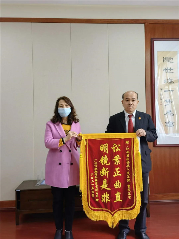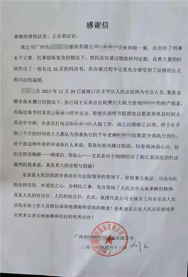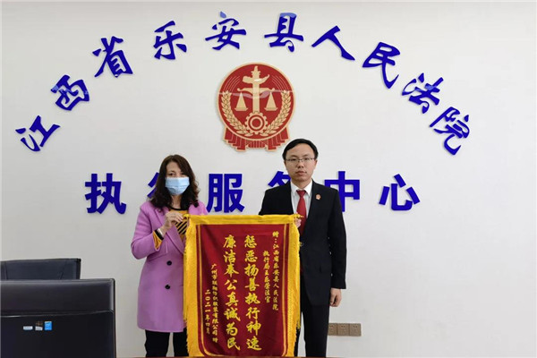 4月13日,广州某服装有限公司法定代表人刘某特意从广州赶赴乐安,将三面锦旗及感谢信赠与乐安县人民法院执行法官王乐荣和民事法官曾民。