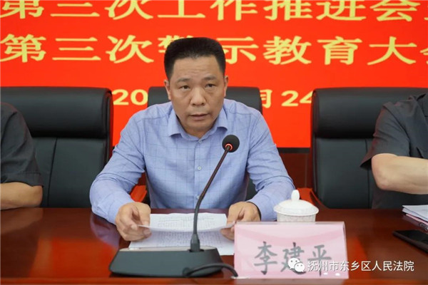为坚定不移把政法队伍教育整顿引向深入,坚持动真碰硬,从严查纠整改,5月24日下午,东乡区法院召开政法队伍教育整顿工作第三次推进会。区委常委、宣传部部长、区政法队伍教育整顿领导小组副组长李建平到会指导,区法院党组书记、院长李好生出席会议并讲话。