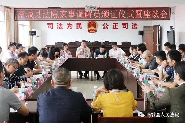 5月28日上午,南城县法院召开了选聘家事调解员颁证仪式暨座谈会,该院党组书记、院长周明文参加会议,并为12个乡镇的家事调解站长、家事调解员代表颁发聘书。县妇联、政法委有关领导及30名家事纠纷特邀调解员参加会议。