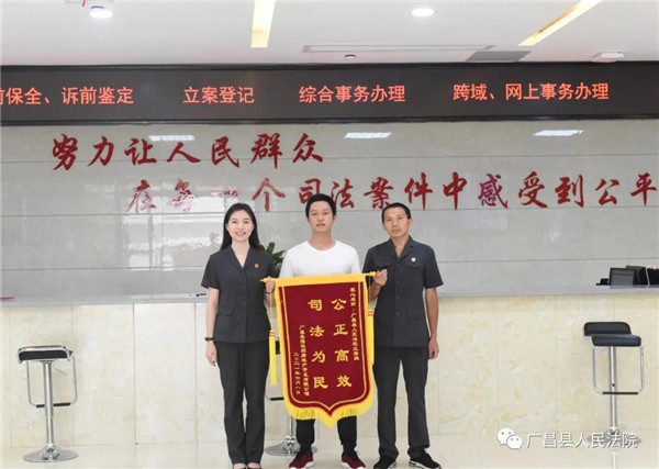 6月9日,广昌县碧桂园房地产开发有限公司(下简称广昌碧桂园公司)法务来到广昌县人民法院诉讼服务大厅,将“公正高效 司法为民”的锦旗送到广昌法院立案庭赖洋法官手中。