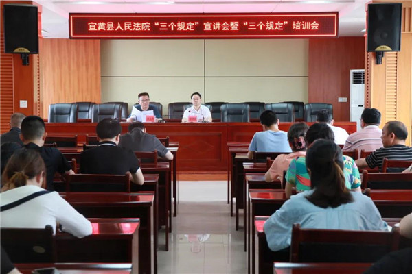 为推动政法队伍教育整顿走深走实,全面提升全院干警对“三个规定”的认识,营造践行“三个规定”的浓厚氛围,6月8日下午,宜黄县人民法院举办“三个规定”宣讲暨“三个规定”培训会。院党组书记、院长陈剑波作宣讲报告。