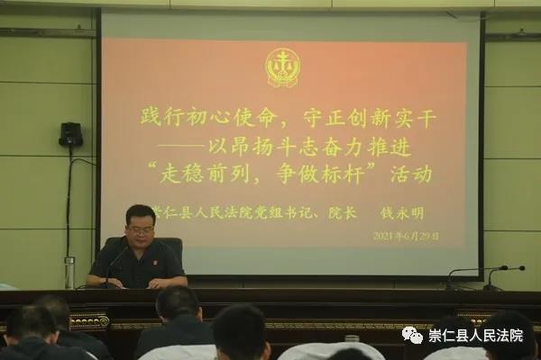 为热烈庆祝中国共产党成立100周年,深入推进党史学习教育,引导法院全体干警学党史、悟思想、办实事、开新局,6月29日下午,崇仁县人民法院党组书记、院长钱永明以“践行初心使命,守正创新实干——以昂扬斗志奋力推进'走稳前列,争做标杆’活动”为主题为全院干警讲授专题党课。