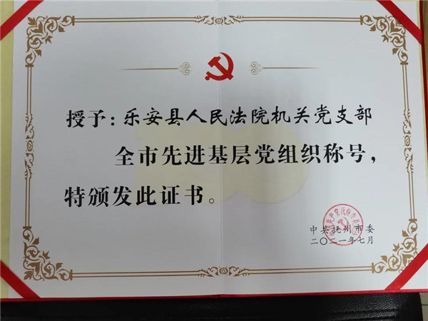 6月30日,在抚州召开的全市“七一”表彰大会,乐安县人民法院机关党支部荣获“全市先进基层党组织”荣誉称号。