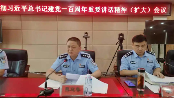 熊迎春同志指出,习近平总书记“七一”重要讲话,立足中国共产党百年华诞的重大时刻和“两个一百年”历史交汇的关键节点,回顾了我们党百年奋斗的光辉历程,展望了中华民族伟大复兴的光明前景,精辟总结了伟大建党精神。他要求,全局党员干警要认真学习习近平总书记在庆祝中国共产党成立100周年庆祝大会上的重要讲话,深入领会党团结带领人民不懈奋斗的光辉历程和伟大成就,深入领会伟大建党精神的深刻内涵和时代价值,深入领会习近平总书记代表党中央发出的伟大号召,要以习近平总书记重要讲话精神为根本遵循,牢记使命,立足本职,攻坚克难,锐意进取,肩负起新时代公安队伍的重任和使命。