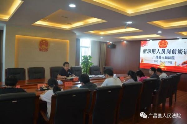 10月9日上午,广昌县人民法院召开新录用人员岗前谈话。该院党组成员、政治部主任姜祖伟主持谈话。