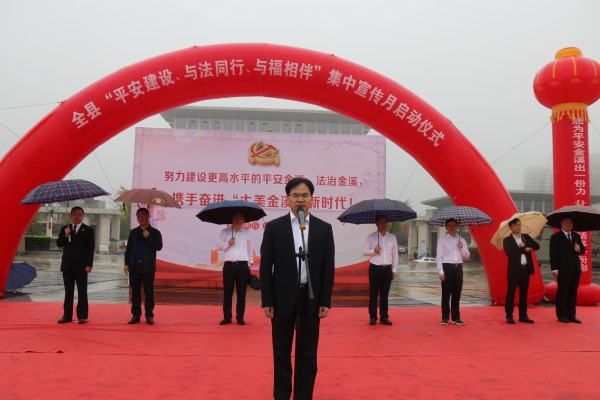为了深化平安建设宣传活动,广泛动员全县各级党政组织、社会各界人士和广大干部群众积极投身平安建设,在全县形成平安建设人人参与、人人建设、人人共享的生动局面,为“大美金溪”新时代创造平安、稳定、和谐的社会环境。10月15日上午,全县“平安建设、与法同行、与福相伴”集中宣传月活动启动仪式在锦绣广场隆重举行,县委书记张文贵出席启动仪式并宣布启动,县委常委、政法委书记罗中原作讲话,副县长候选人、县公安局局长杨美文主持。县委常委、宣传部长万小平,县人大常委会副主任徐斌,副县长候选人、对桥镇党委书记谢赛赛,县政协副主席周国富,县法院党组书记、代院长童溪水,县检察院党组书记、代检察长周德龙出席启动仪式。