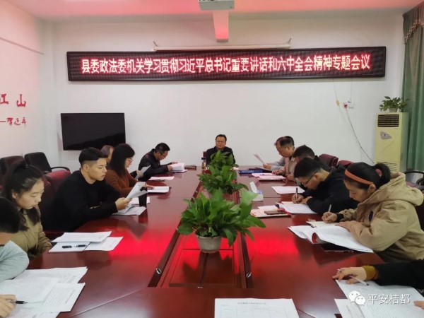 11月15日上午,县委政法委机关组织召开学习贯彻习近平总书记重要讲话和十九届六中全会精神专题会议,深入学习传达贯彻党的十九届六中全会精神,研究部署贯彻落实。县委常委、政法委书记游俊主持会议并讲话。