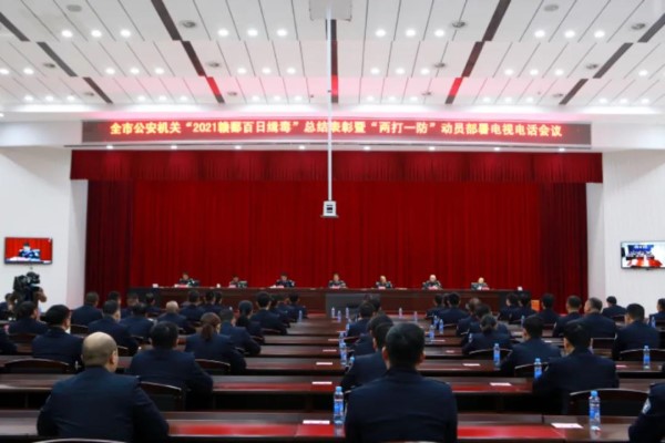 12月23日下午,全市公安机关“2021赣鄱百日缉毒”总结表彰暨“两打一防”动员部署电视电话会在市公安局八楼会议室召开。副市长、市公安局党委书记、局长韩潮出席会议并讲话。