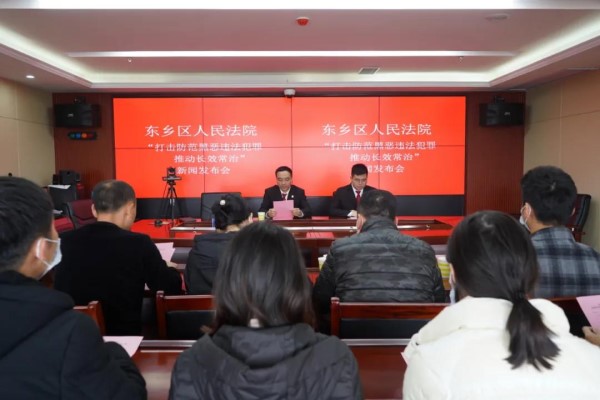 12月21日上午,抚州市东乡区人民法院在诉讼服务中心三楼召开“打击防范黑恶违法犯罪,推动长效常治”新闻发布会。