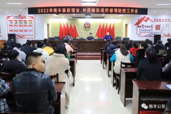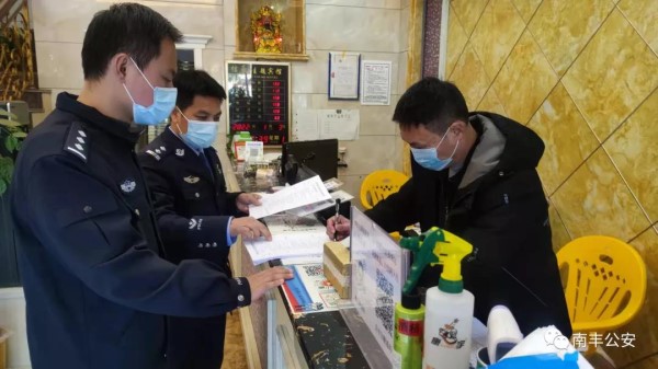 南丰县公安局治安大队召开旅馆业疫情防控工作会议,组织警力走进辖区65家旅馆及各休闲场所,进行治安防控指导,并严格按照疫情防控要求,检查、督导是否落实旅馆业“四实”登记;