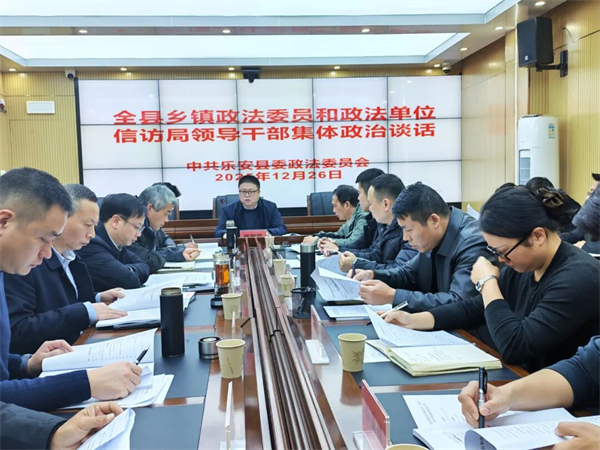 12月26日,县委常委、政法委书记陈若旻与全县乡镇政法委员和县政法单位、县委信访局领导干部开展集体政治谈话。会议由县委常委、政法委书记陈若旻同志主持,县纪委监委派驻县委政法委纪检组组长陈宇红同志到会指导。